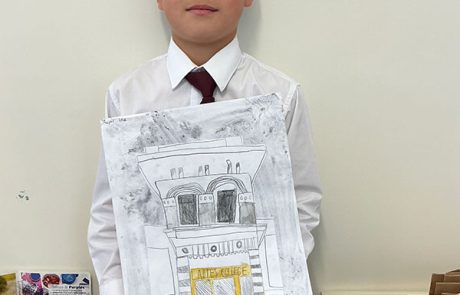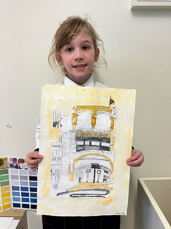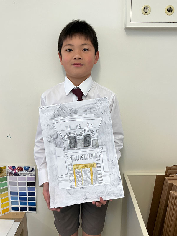 - Georgia Cugley first place, and Jasper Lin third place in the Years 1 & 2 section – Architectural line drawing of The Boarding House in collage and water colour.