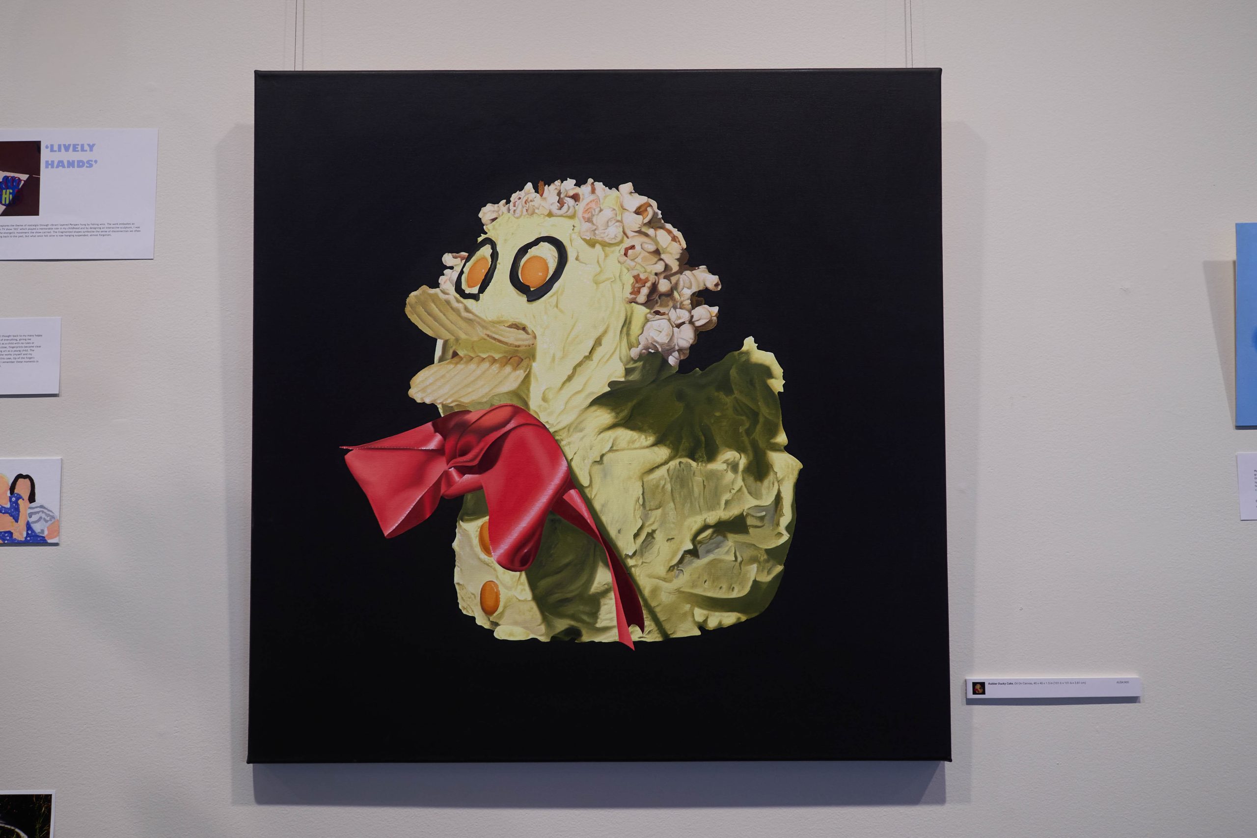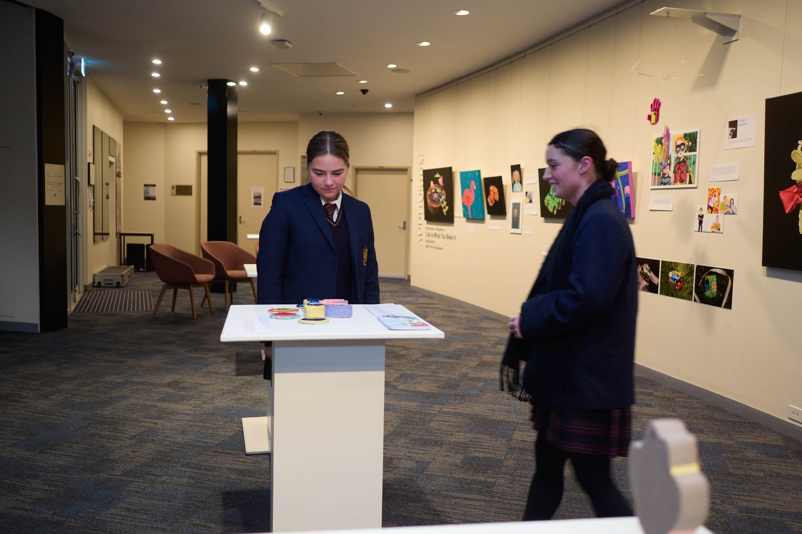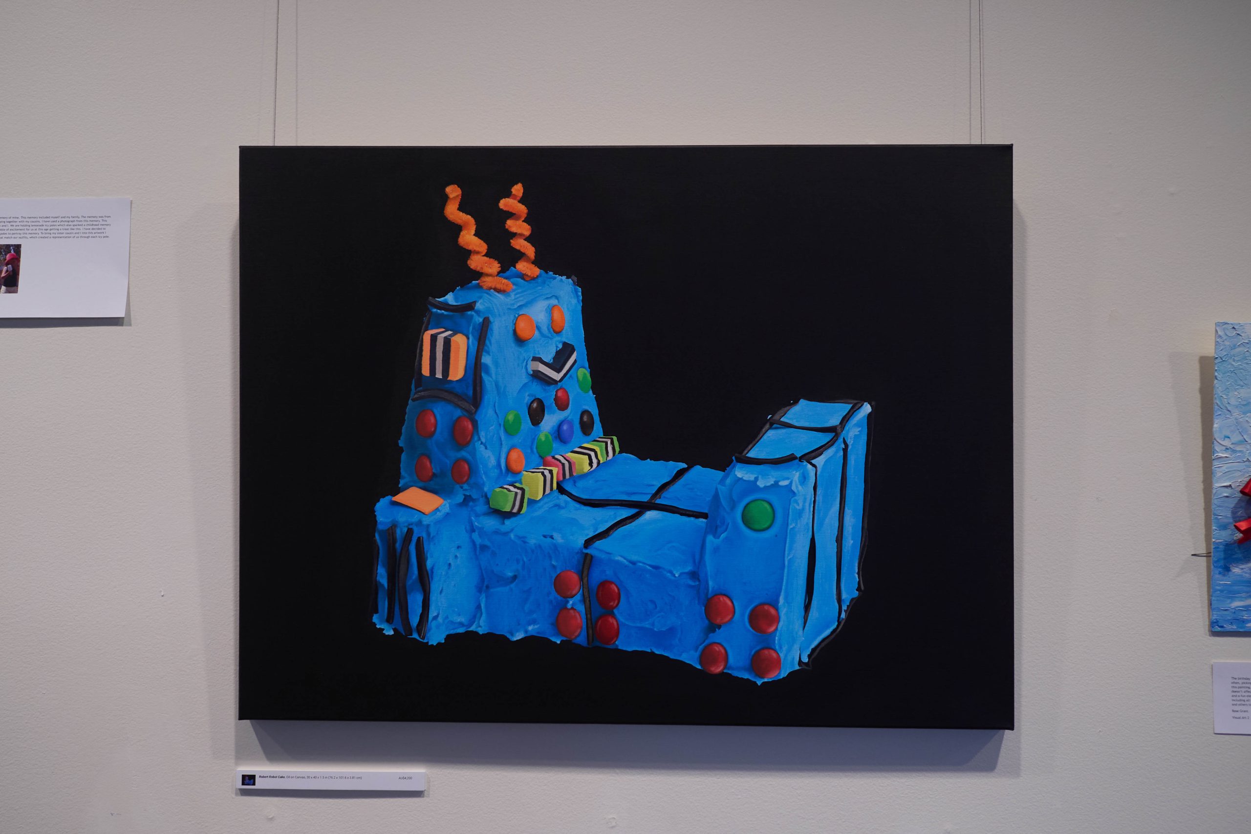 Katie’s exhibition, Life is What You Bake It, held in the College’s s.p.a.c.e. Gallery, became a shared artistic milestone. Inspired by the nostalgic charm of the Australian Women’s Weekly Birthday Cake Book, the theme resonated with students. TCE artists explored their own interpretations – memories of birthdays, family rituals, and the creative whimsy of childhood, all exhibited alongside Katie’s works. One particularly unique collaboration came from the Year 9 Pastry Chef class. Students baked cakes inspired by Katie’s subjects, which were then photographed and transformed into paintings, blending culinary art with visual storytelling in a wonderfully interdisciplinary learning moment.