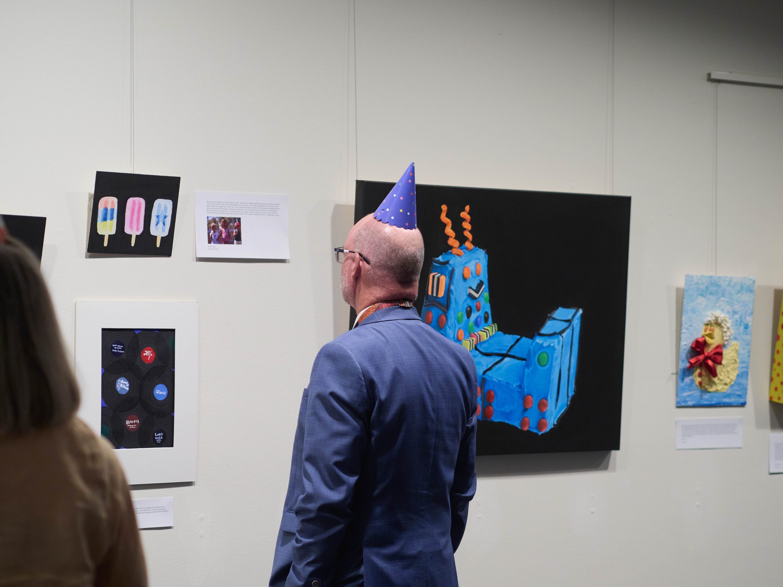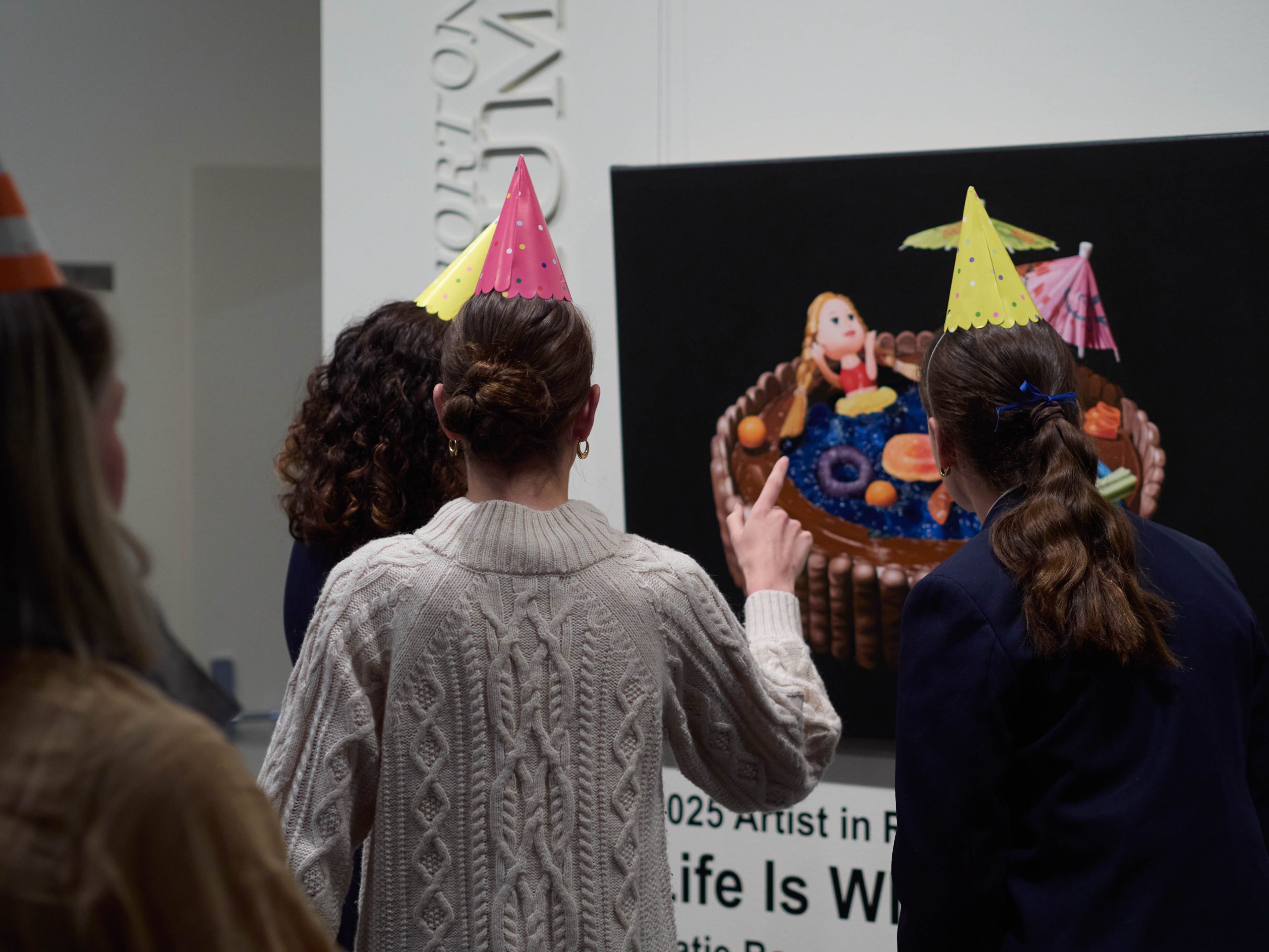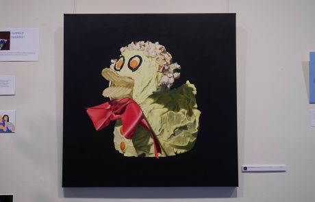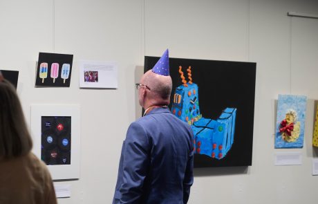 Katie’s exhibition, Life is What You Bake It, held in the College’s s.p.a.c.e. Gallery, became a shared artistic milestone. Inspired by the nostalgic charm of the Australian Women’s Weekly Birthday Cake Book, the theme resonated with students. TCE artists explored their own interpretations – memories of birthdays, family rituals, and the creative whimsy of childhood, all exhibited alongside Katie’s works. One particularly unique collaboration came from the Year 9 Pastry Chef class. Students baked cakes inspired by Katie’s subjects, which were then photographed and transformed into paintings, blending culinary art with visual storytelling in a wonderfully interdisciplinary learning moment.